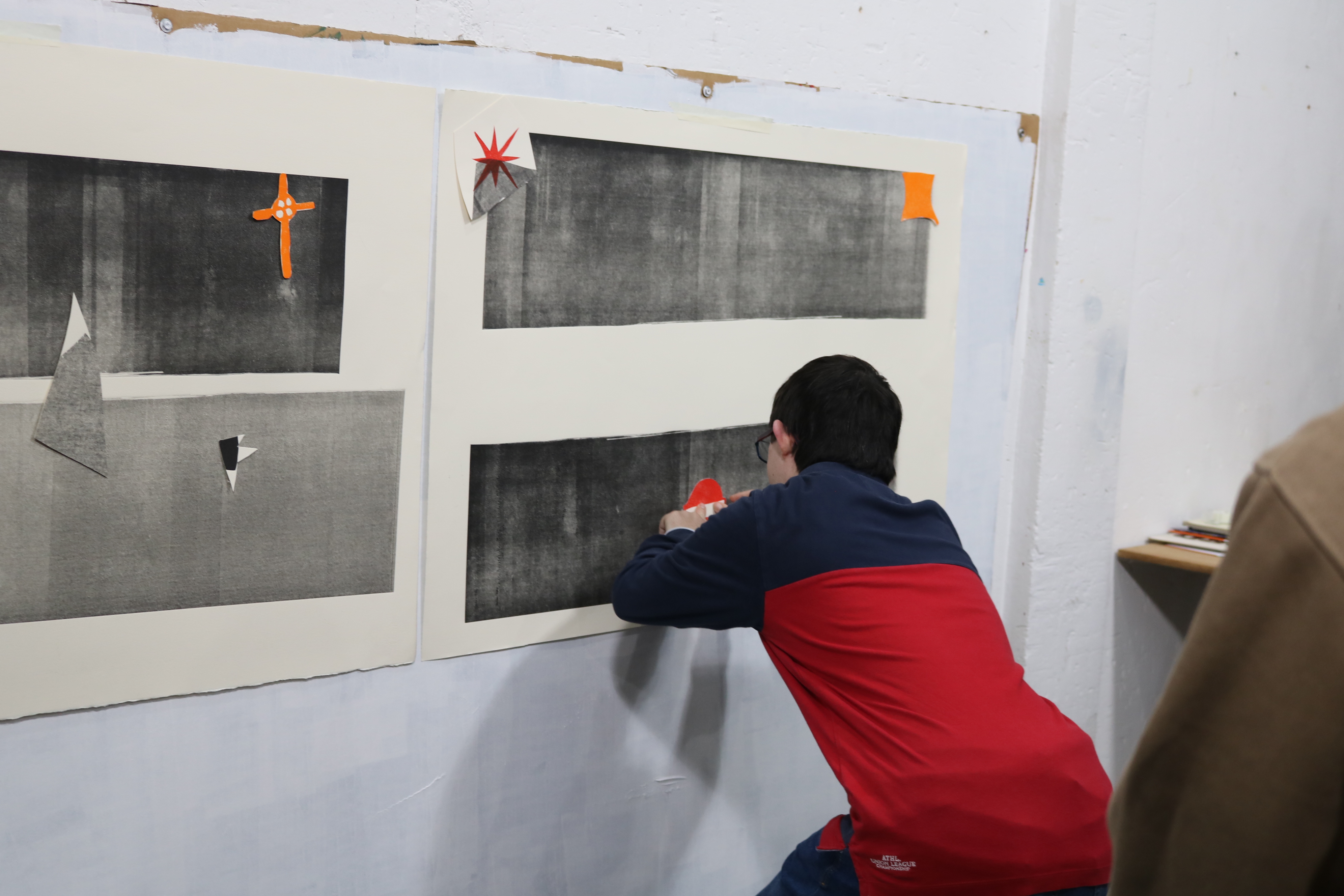El tercer encuentro comenzó con la última fase de estampación, utilizando el color rojo. Una vez finalizado este paso, el grupo se dividió en dos subgrupos, cada uno encargado de montar una composición final con las siluetas ya impresas.