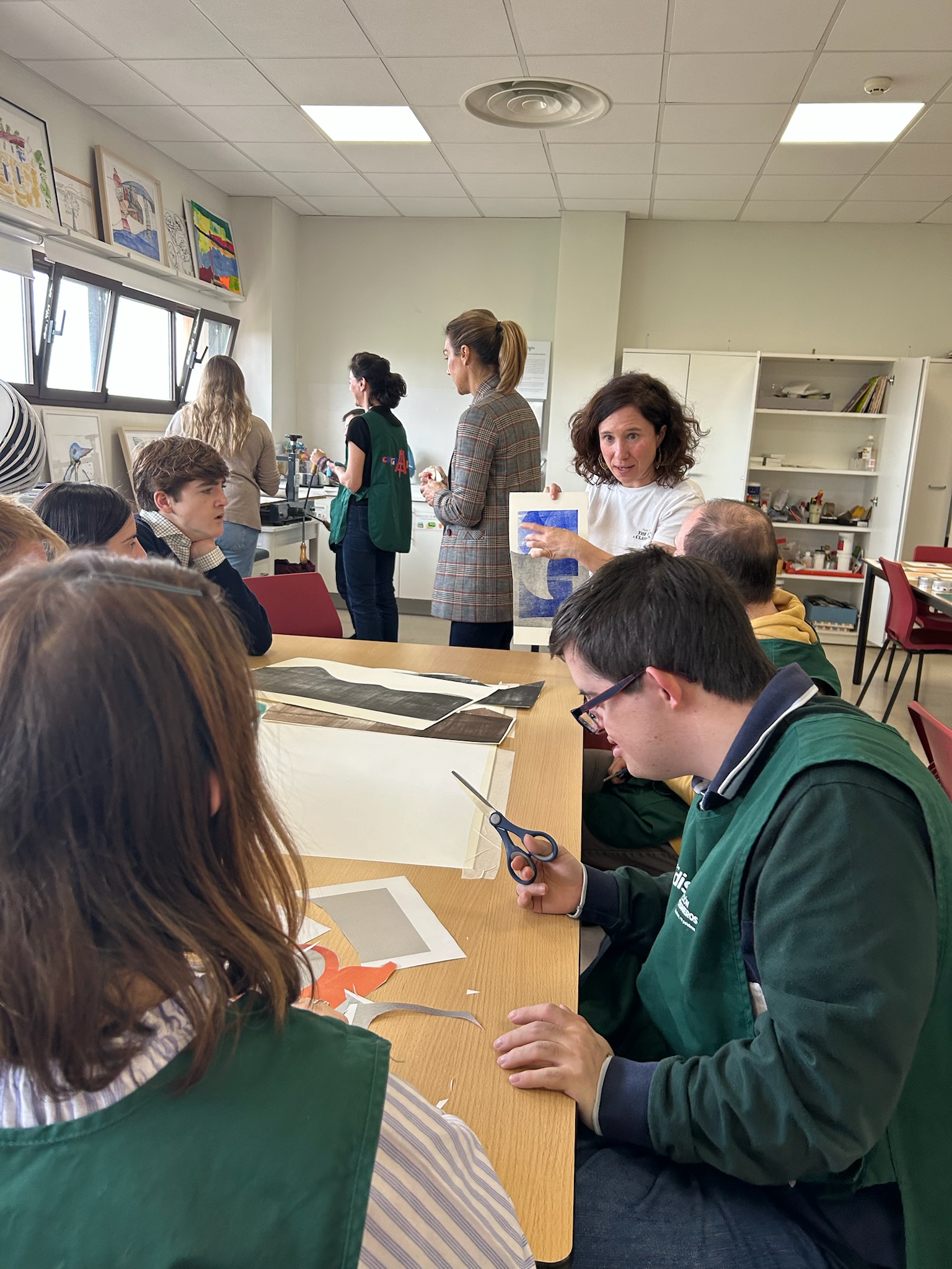 Silvia presentó el taller y explicó la técnica del monotipo, despertando gran interés entre los participantes. Lo más destacado fue la reactivación del tórculo, que Silvia decidió utilizar tras verlo en desuso en la Fundación. Como introducción, mostró algunas de sus propias obras y trajo imágenes de Joan Miró para inspirar al grupo.