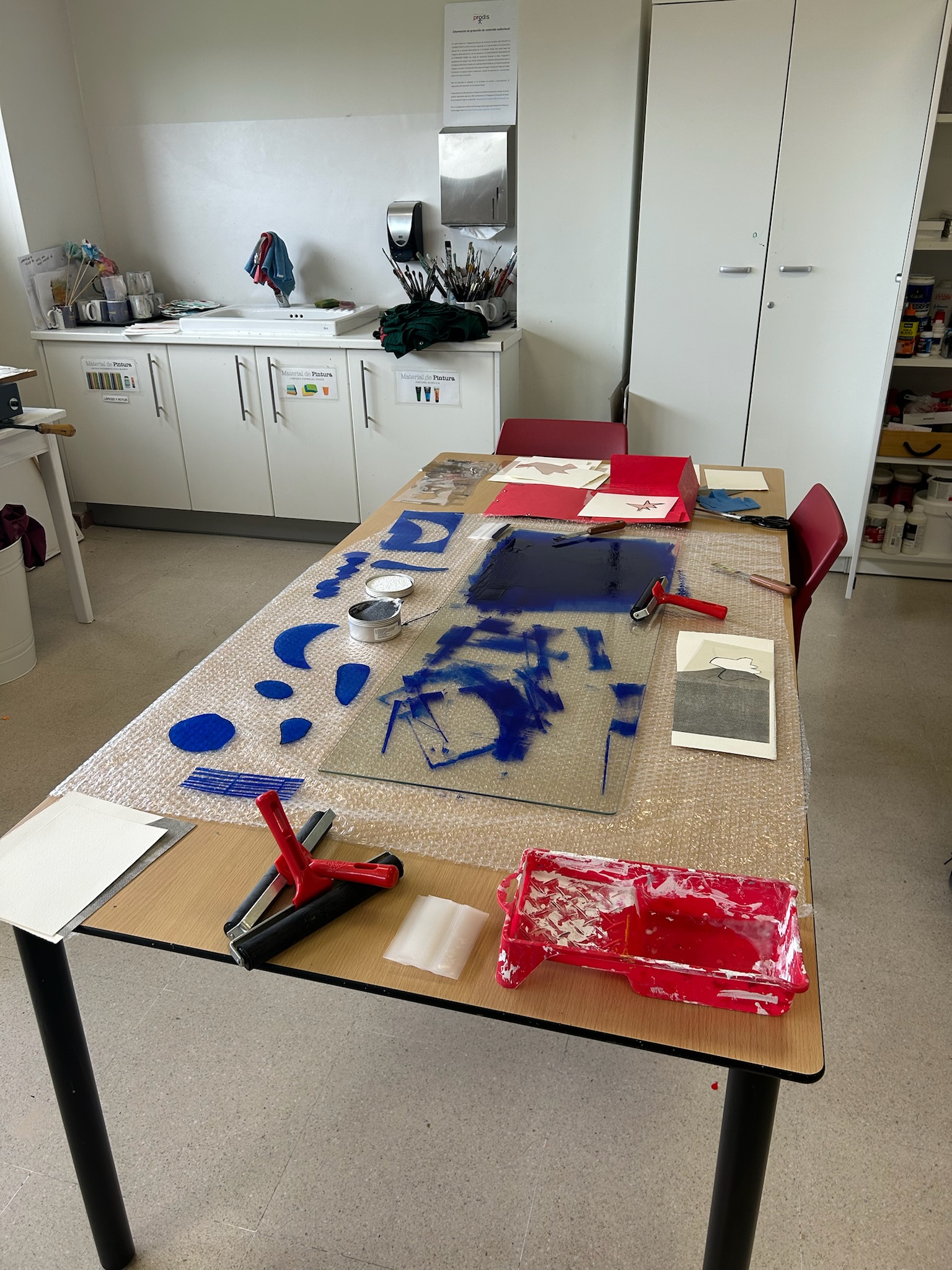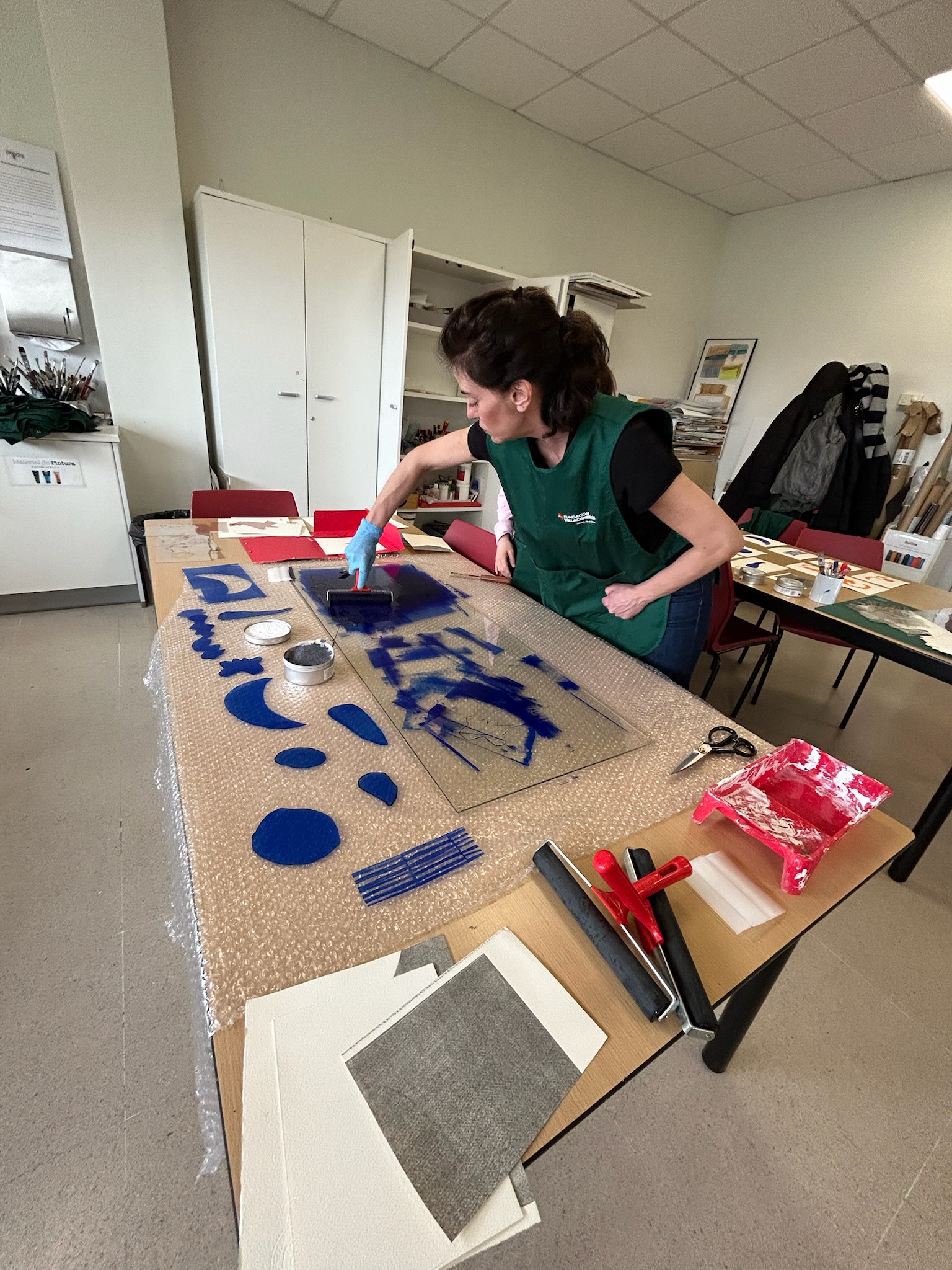 En esta sesión se continuó el proceso de impresión, ahora con el color azul. Cada participante eligió qué siluetas estampar en este tono. Mientras algunos usaban el tórculo, otros comenzaron a experimentar con la disposición de las figuras para la obra final.