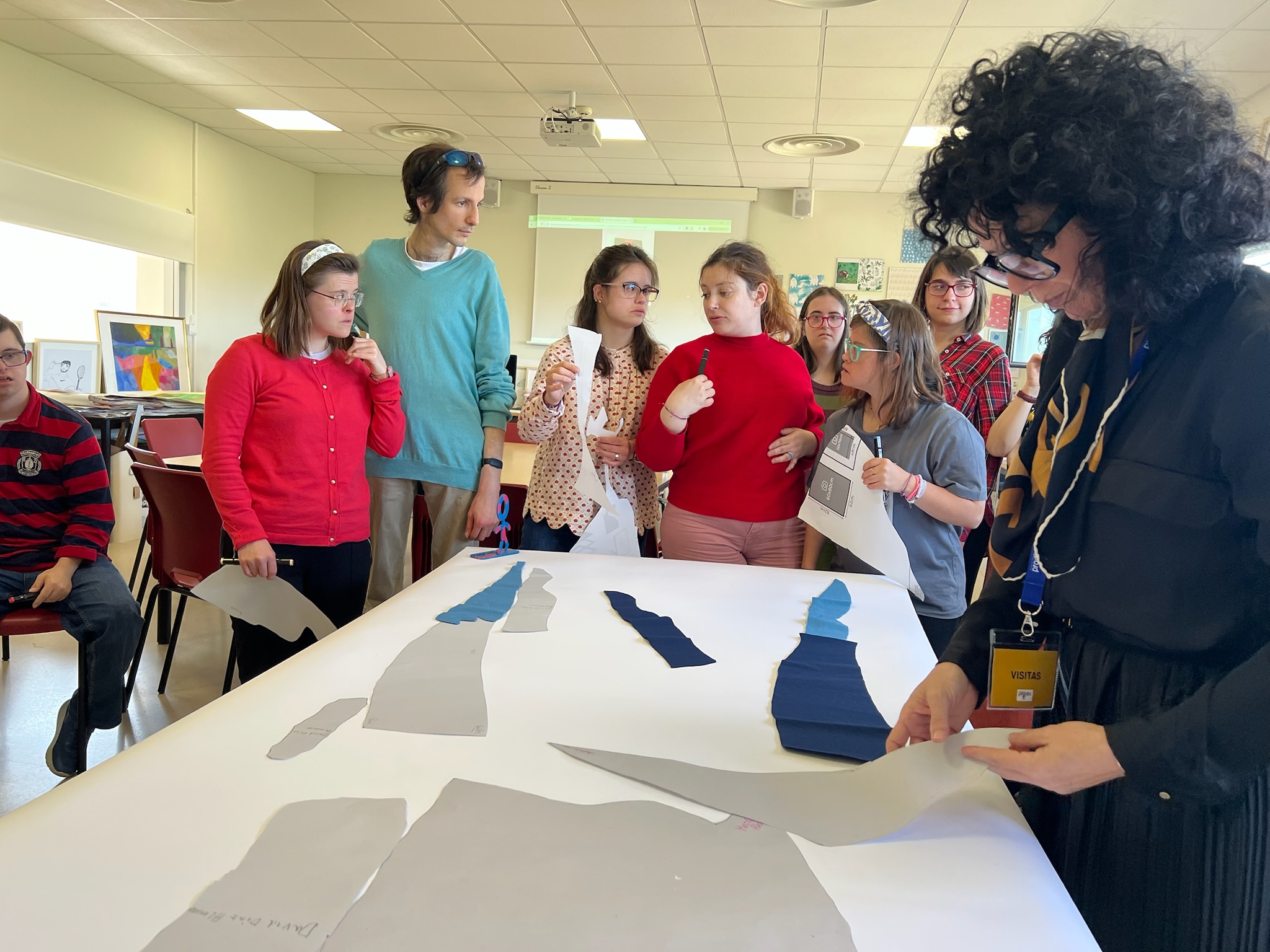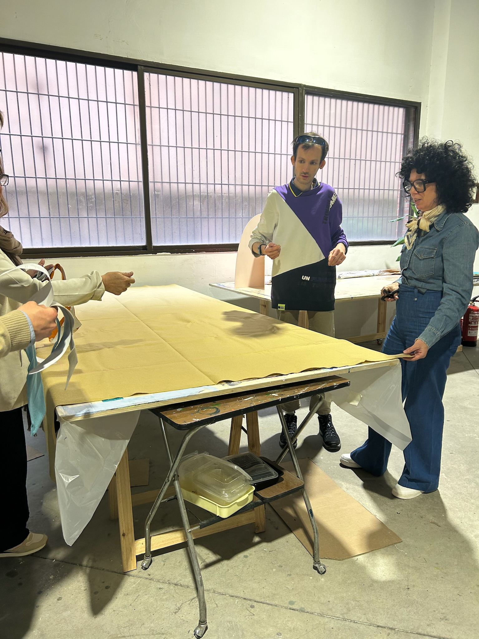 La tercera jornada tuvo lugar en el estudio de Sonia Navarro, un espacio íntimo donde el proceso artístico cobra vida. Allí, Sonia tenía preparados los fieltros de colores, y cada uno de los participantes contaba con su silueta de papel, que representaba su viaje. La tarea consistía en recortar las siluetas en fieltro, trasladando sus recorridos personales al material textil.