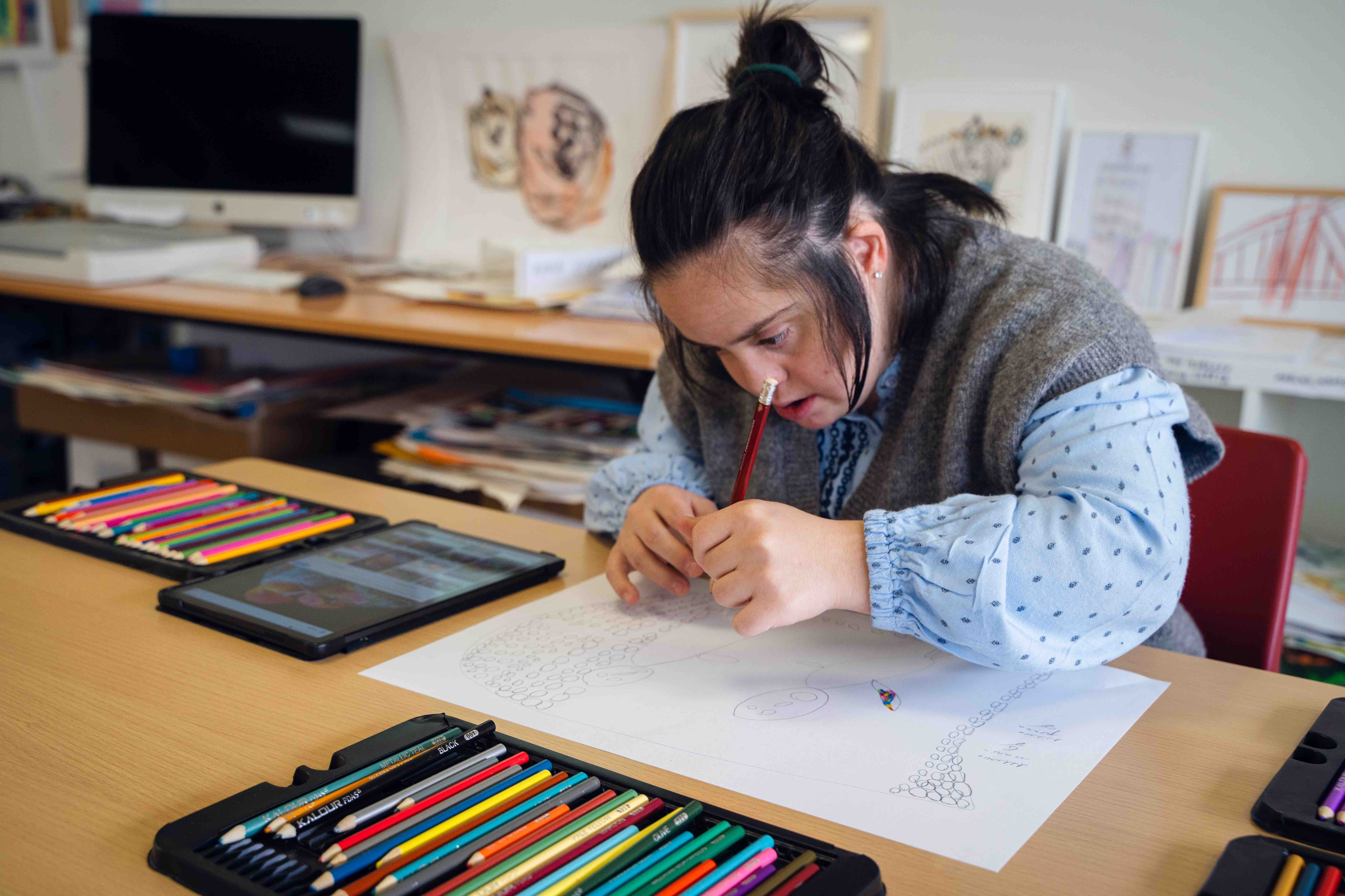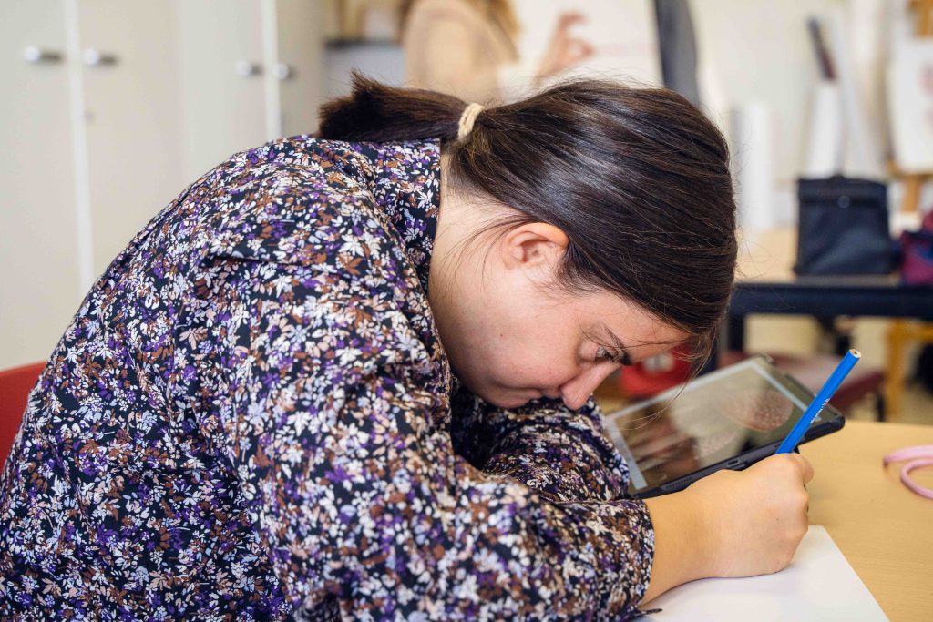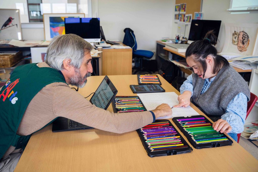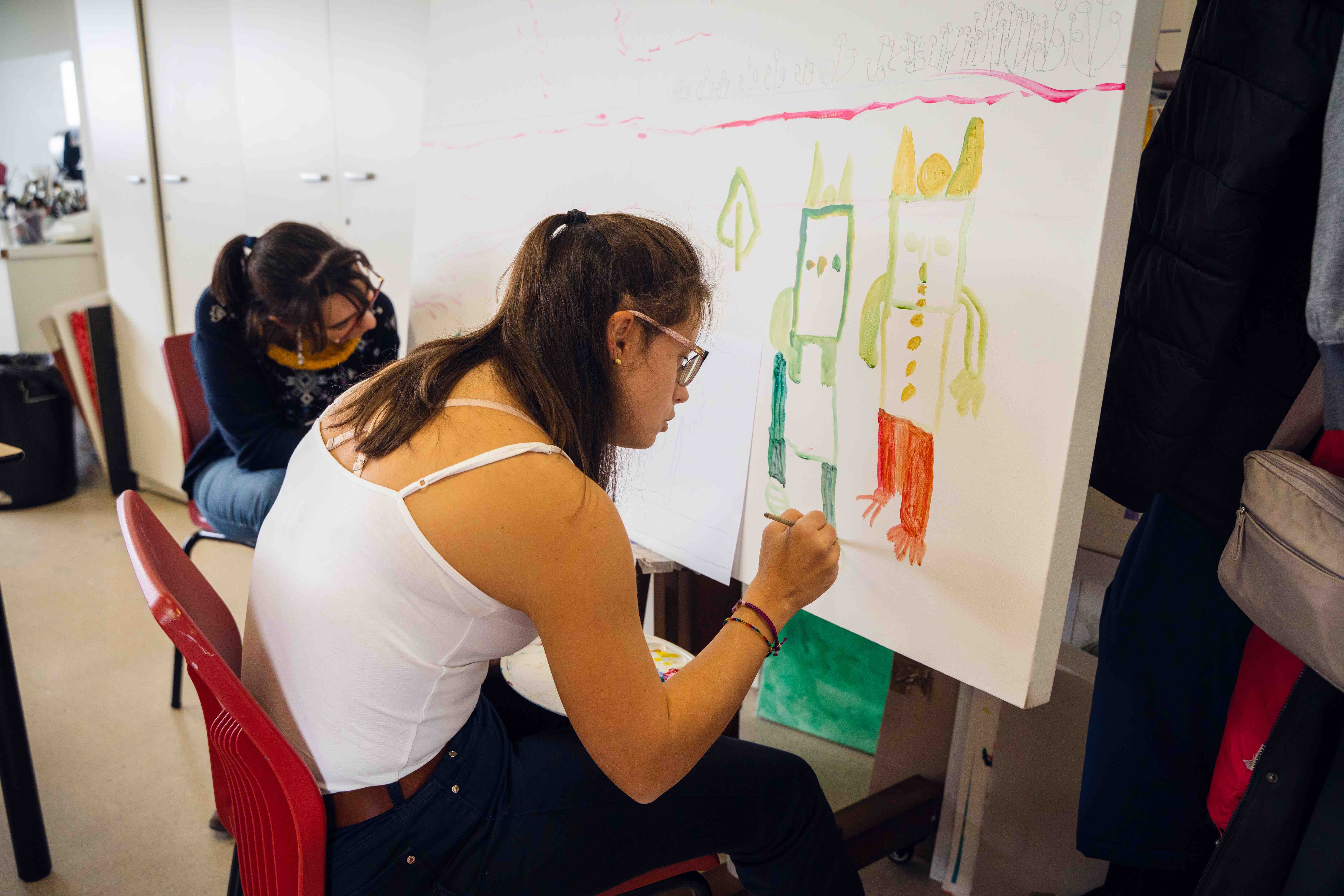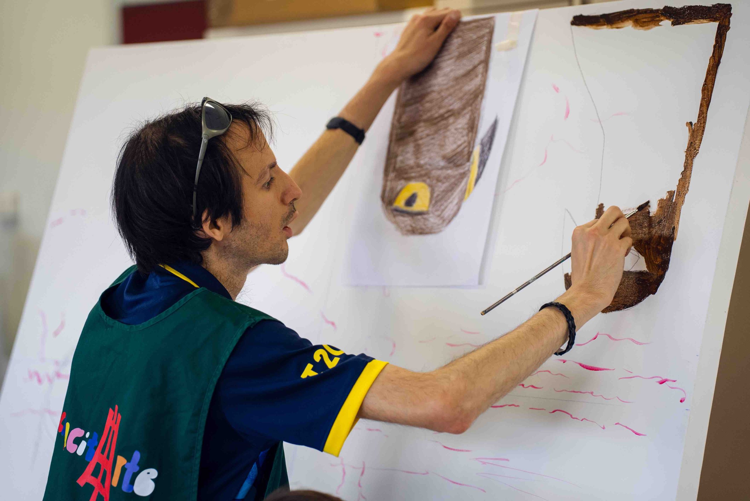 El taller fue muy libre y creativo. Cada uno comenzó haciendo bocetos en papel, explorando ideas y dando forma a los elementos que luego plasmarían en el lienzo. Una vez que tenían claro qué querían representar, decidían junto con Iñigo en qué parte del fondo común colocar sus dibujos para que todo encajara de forma armónica. Después pasaban a la pintura, trabajando con acrílico y representando aquello en lo que cada uno se sentía más experto: animales, plantas, texturas o pequeños detalles que enriquecían la escena.