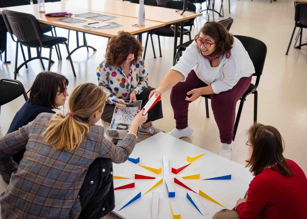 Comenzamos la sesión repasando, a través de fotografías, las composiciones creadas el día anterior. Cada equipo había elaborado tres o cuatro propuestas distintas y, tras un proceso de votación, seleccionamos las cuatro más representativas. A partir de ahí, cada grupo debía recrear su composición elegida y trasladarla al tablero final.